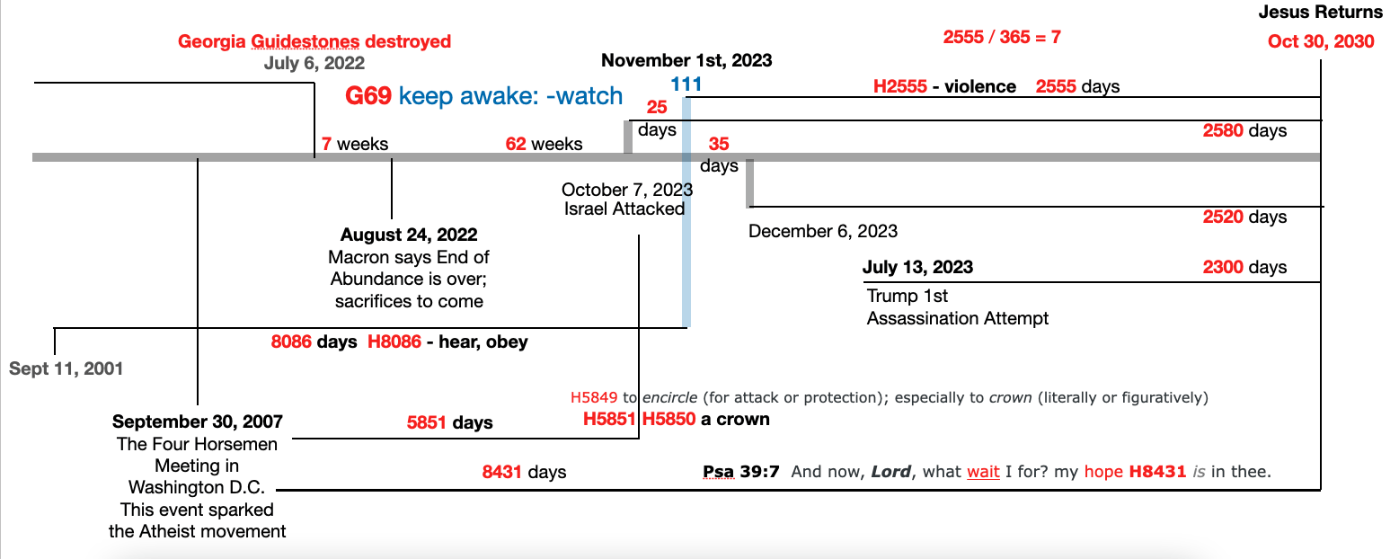 Through Biblical codes and patterns I extracted from the King James Version of the Bible. The prophetic rules were already defined in Daniel and Revelation.  There is a timeline defined in Daniel 12:7 which consists of 1290 units for half a week; 2580 for a full week.  The other timeline was defined in Revelation 11:3 which consists of 1260 days for half a week; 2520 for a full week.  And finally, there was one final clue that was given that would unseal the start of the timeline.